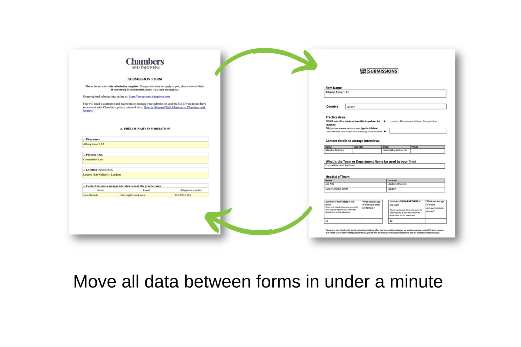 Save time by cloning your latest Chambers & Partners* submissions into Legal 500* submissions (and other forms) with a few clicks (and vice versa).